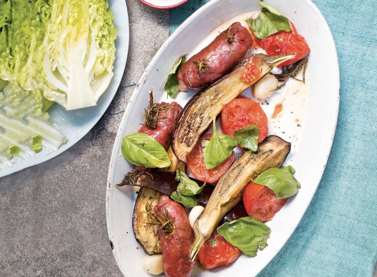 Verdeel de aubergine, tomaat en het basilicum over een schaal of 4 borden. Pel de tenen knoflook en leg erbij. Snijd de worstjes eventueel in stukken en verdeel over de salade. Besprenkel met de rest van de olie en de azijn en serveer met de romainesla. Lekker met ciabatta en wat geroosterde pijnboompitten erover.