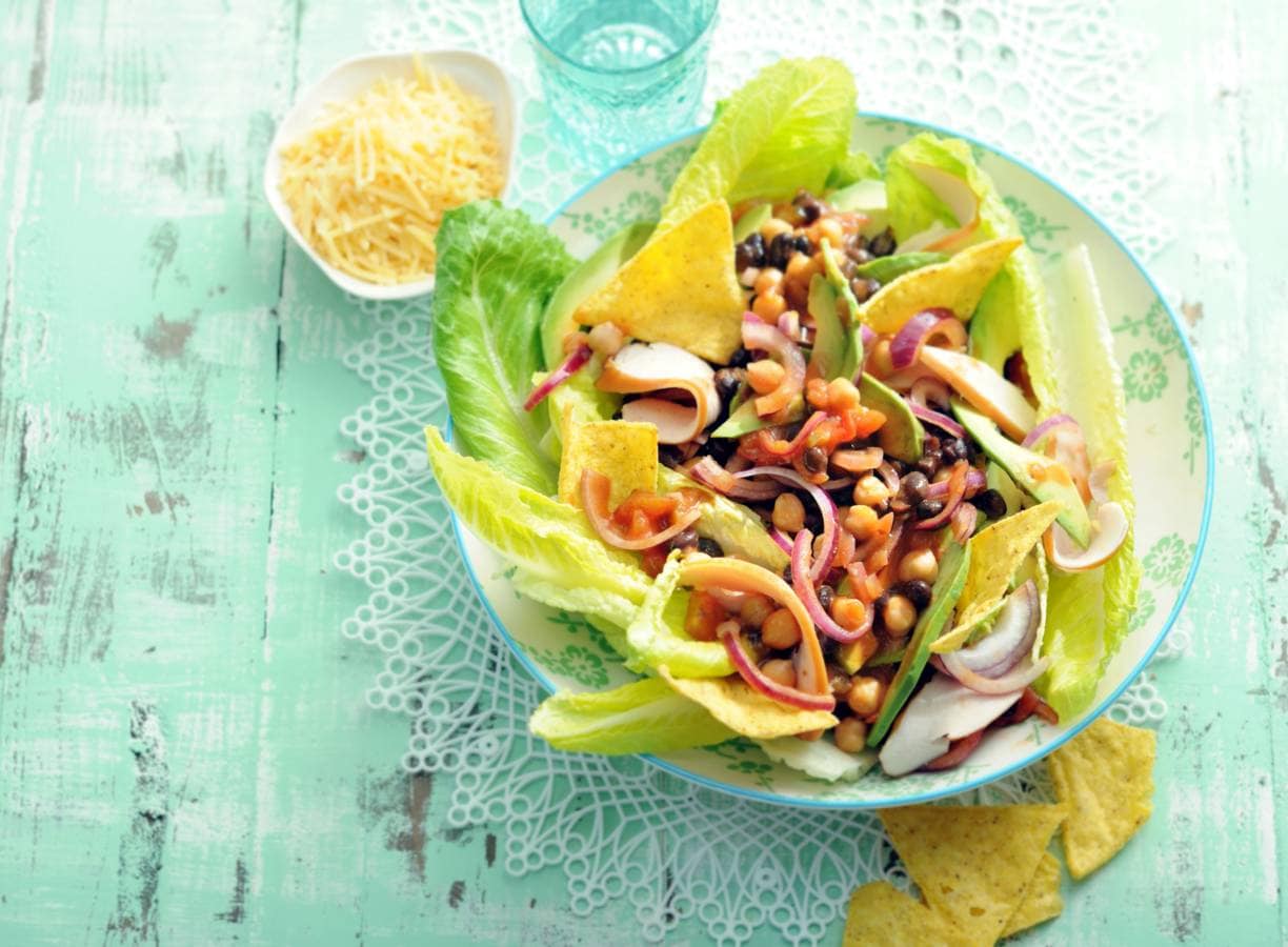 Snijd de avocado overlangs doormidden, verwijder de pit en schep het vruchtvlees met een lepel uit de schil. Snijd het vruchtvlees in plakjes. Haal de slabladeren los. Leg ze op een platte schaal. Schep het bonenmengsel, de kip en avocado erop en eromheen. Serveer de chips er apart bij en steek wat van de chips in de salade.