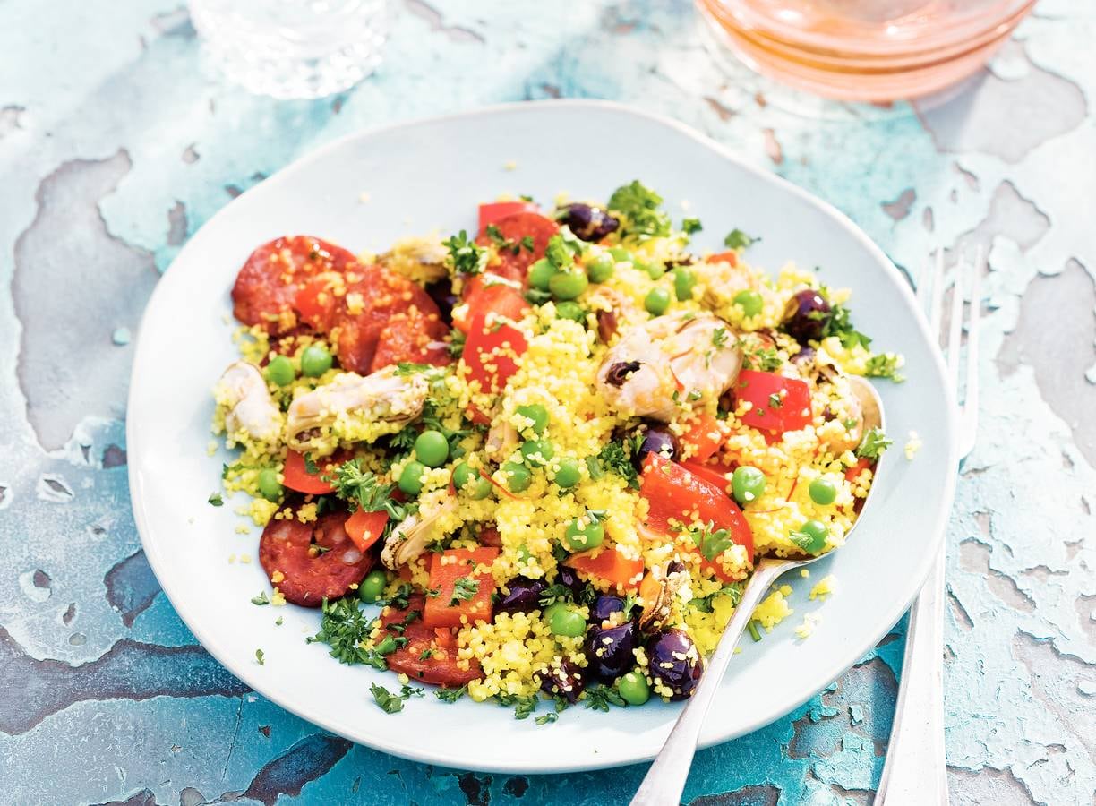 Roer ondertussen de couscous met de olie los met een vork. Schep de couscous op een grote ronde schaal. Snijd de peterselie fijn. Schep de couscous om met het groente-mosselmengsel, olijven, (versgemalen) peper en eventueel zout. Verdeel de chorizo en peterselie erover.