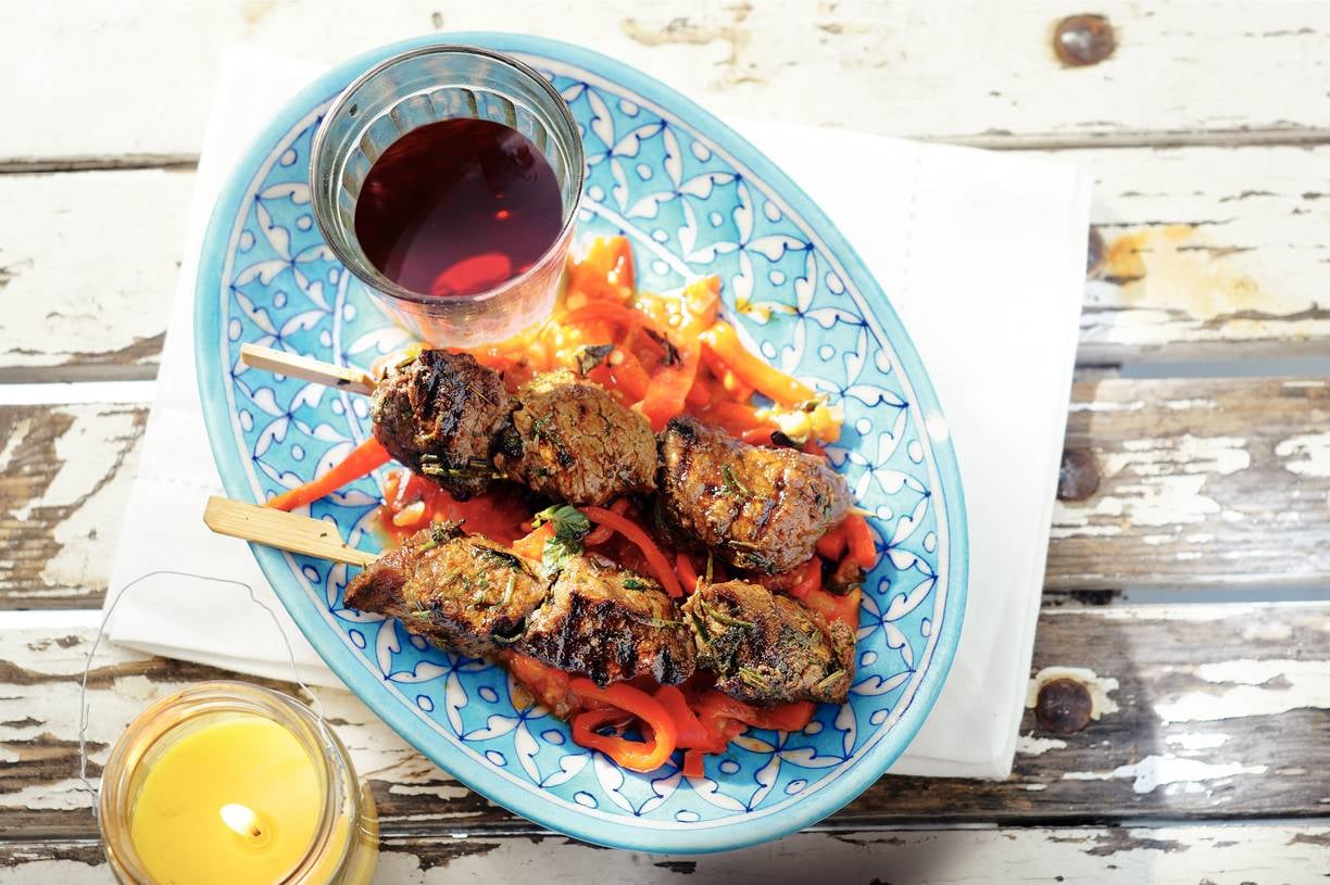 Biefstukspiesen met gestoofde paprika en oregano