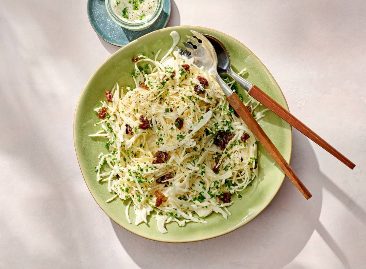 Zin een wittekoolsalade? Ga aan de slag met deze 'coleslaw' met een dressing van yoghurtmayonaise en de frisse tonen van dragon, bieslook en karwij.