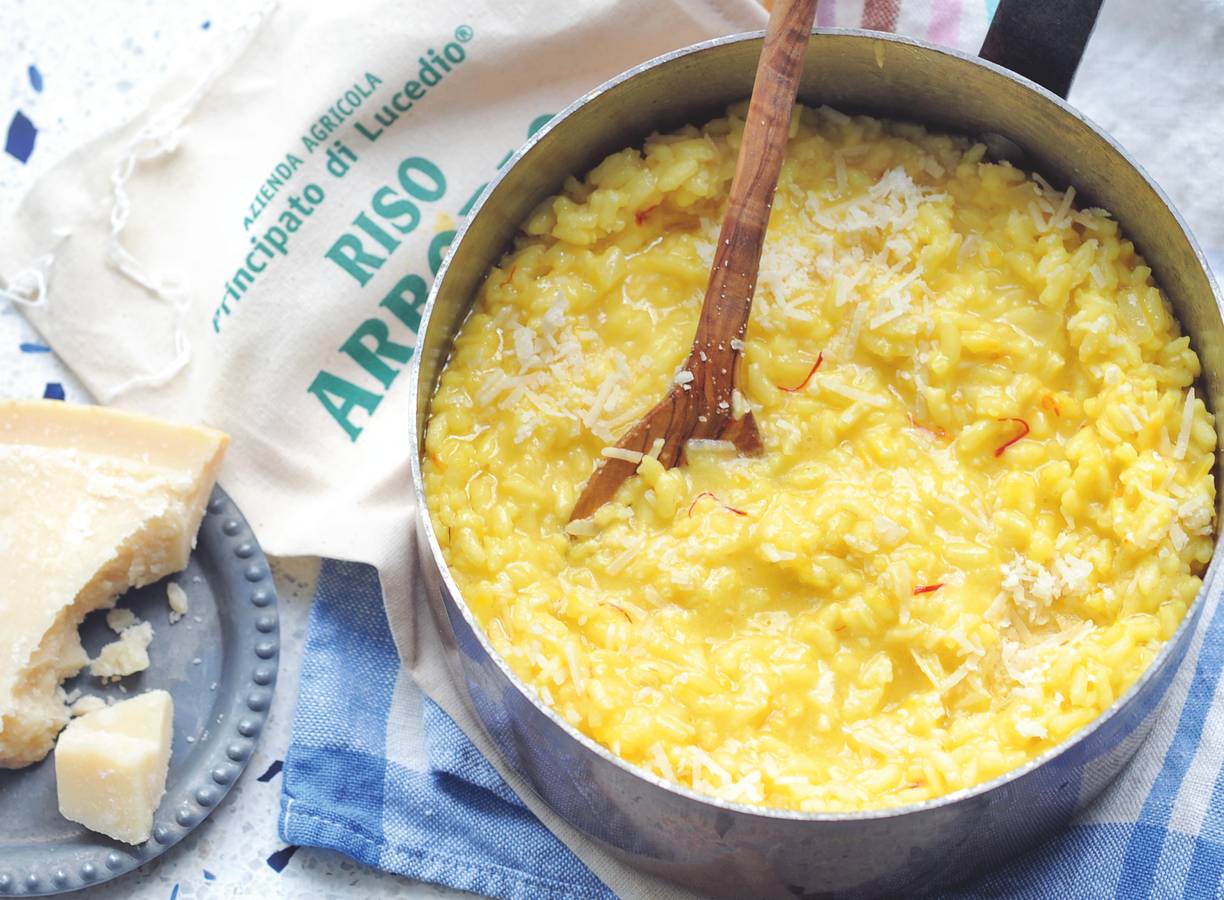 Zeef de bouillon, doe terug in de pan en houd warm. Doe 3 el warme bouillon en de saffraan in een kommetje.