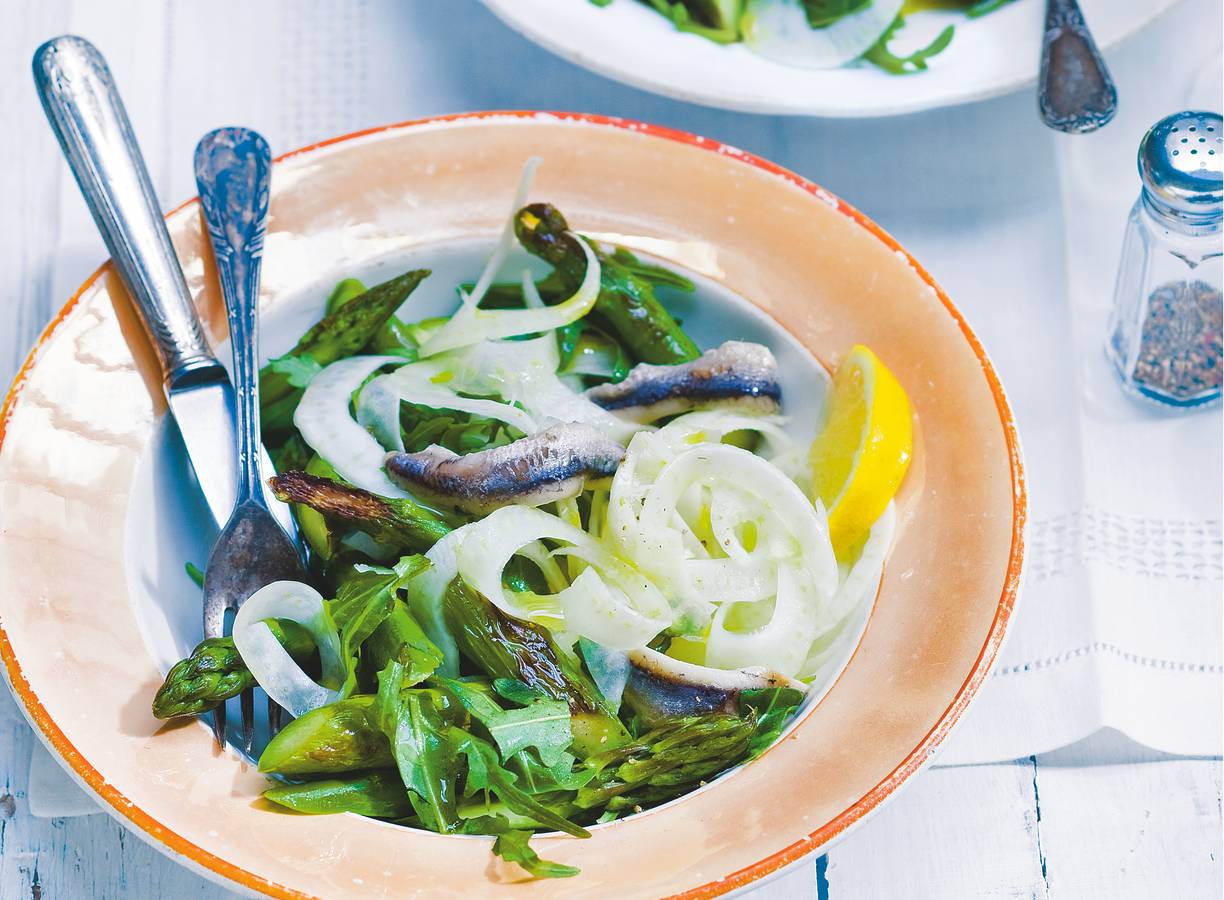 Neem de ansjovis uit de melk, dep droog met keukenpapier en verdeel over de salade. Serveer direct.