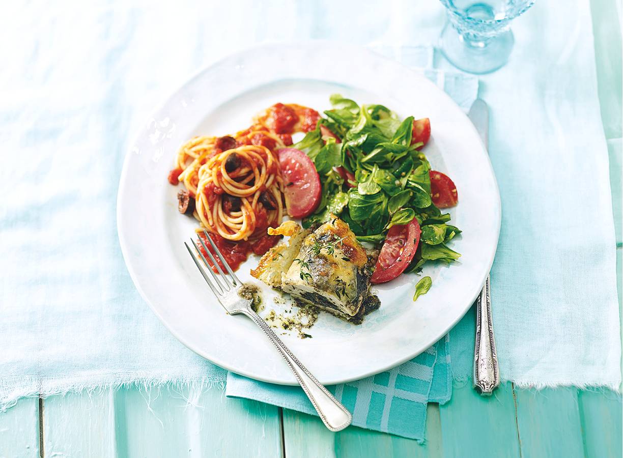 Kook ondertussen de spaghetti volgens de aanwijzingen op de verpakking beetgaar. Verwarm de pastasaus. Snijd de tomaten in parten. Verdeel de veldsla en tomaten over een schaal. Verdeel de dressing erover.