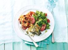 Giet de spaghetti af en meng met de pastasaus. Schep op de borden. Verdeel de kipfilet in gelijke porties en leg erbij. Serveer met de salade.