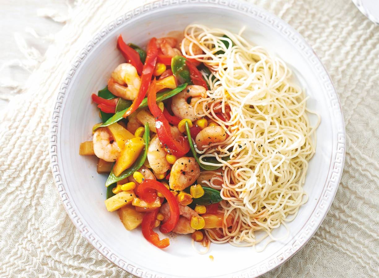 Verwarm de mihoen volgens de aanwijzingen op de verpakking. Serveer met de zoetzure garnalen ernaast.