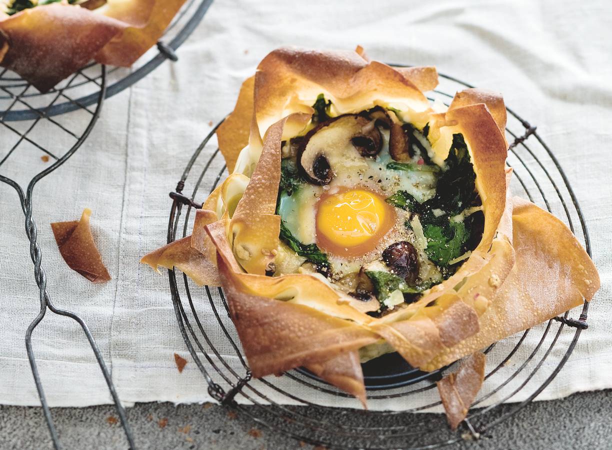 Verdeel het mengsel over de vormen. Breek in het midden van elk taartje een ei. Bak de taartjes ca. 20 min. in het midden van de oven. Ze zijn gaar als het ei gestold is.