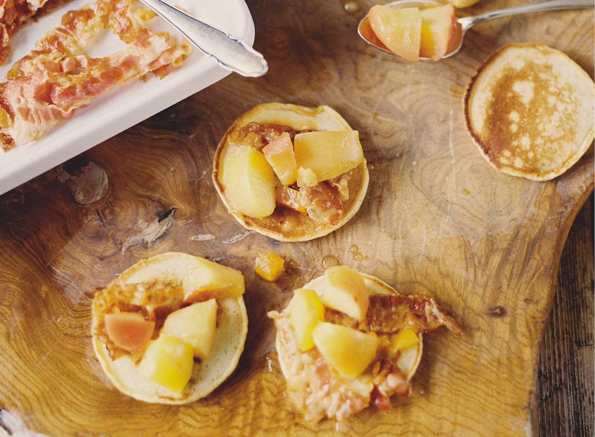 Neem de compote van het vuur, verwijder het vanillestokje en serveer met de pancakes en het ontbijtspek.
