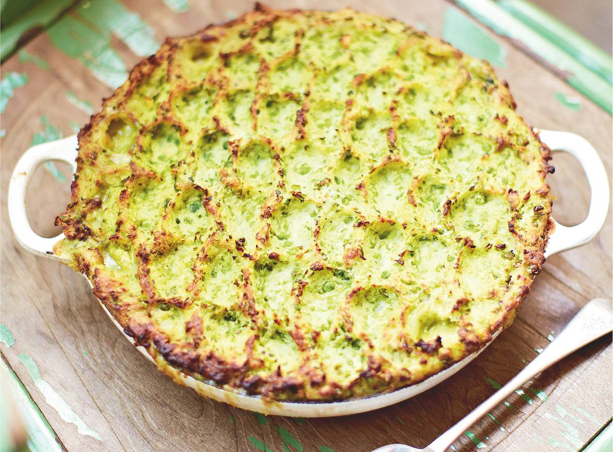 Schep de doperwtenpuree erop, strijk het oppervlak glad en maak er met een vork of lepel een leuk patroontje in. Zet de pastei 30 tot 40 min. in de oven, of tot hij prachtig goudbruin is.