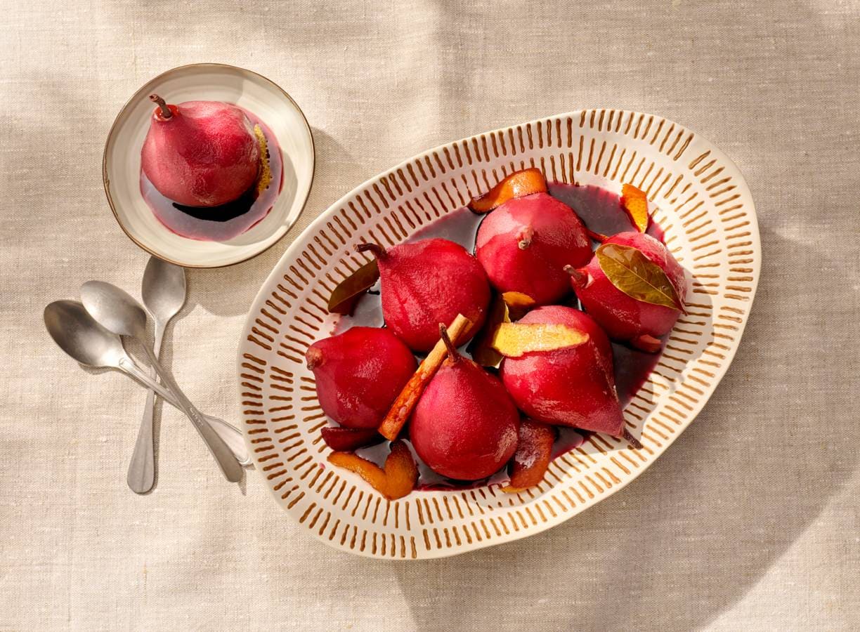 Breng de peren met de port, citrusschil, het kaneelstokje, de kruidnagels, het laurierblaadje en de suiker aan de kook. Laat op laag vuur 45 min. koken zonder deksel op de pan. Serveer de peren warm, lauw of koud.