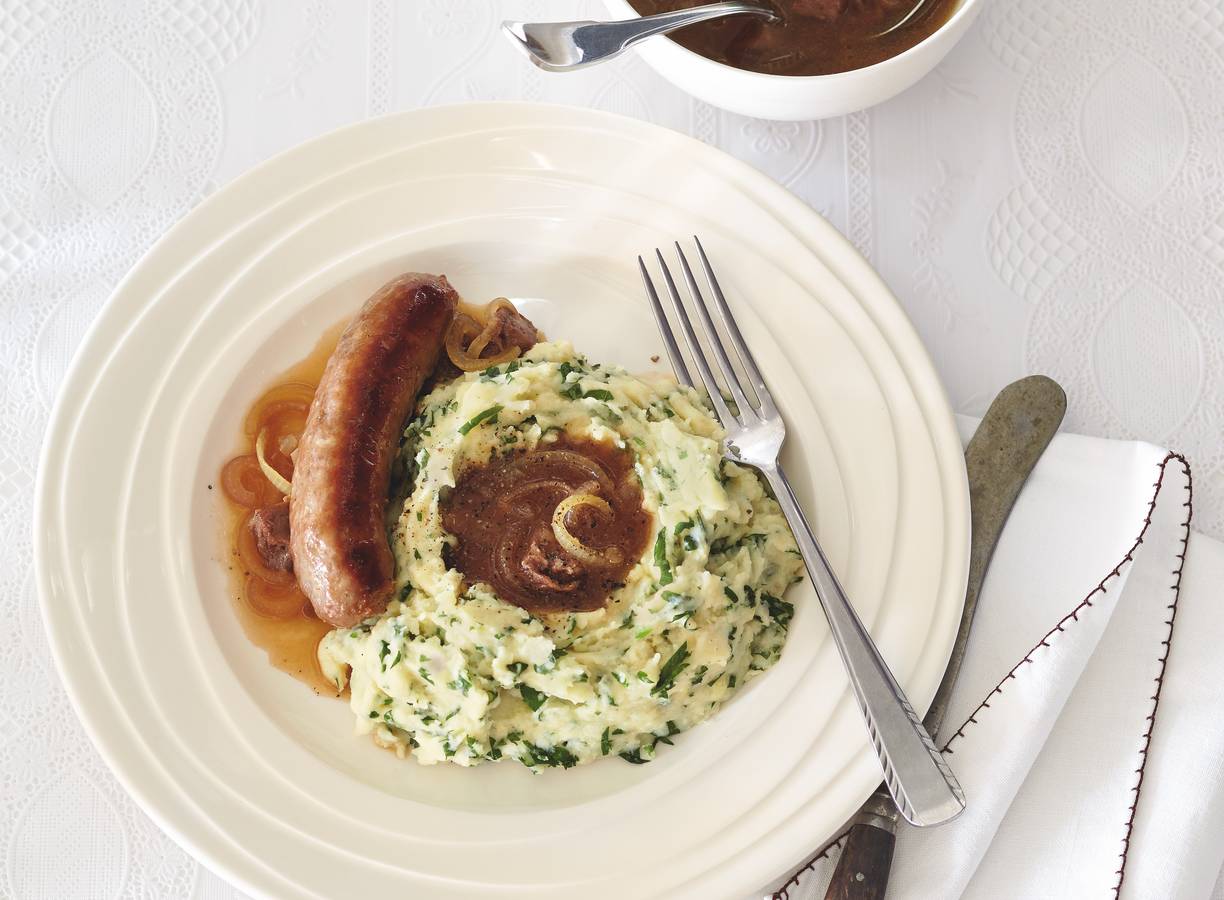 Verhit de helft van de boter in een braadpan en braad de worsten op matig vuur in 10 min. rondom bruin en gaar. Keer regelmatig. Snijd ondertussen de ui in halve ringen en de peterselie fijn. Leg in een ovenschaal en dek af met aluminiumfolie. Houd warm in de oven.