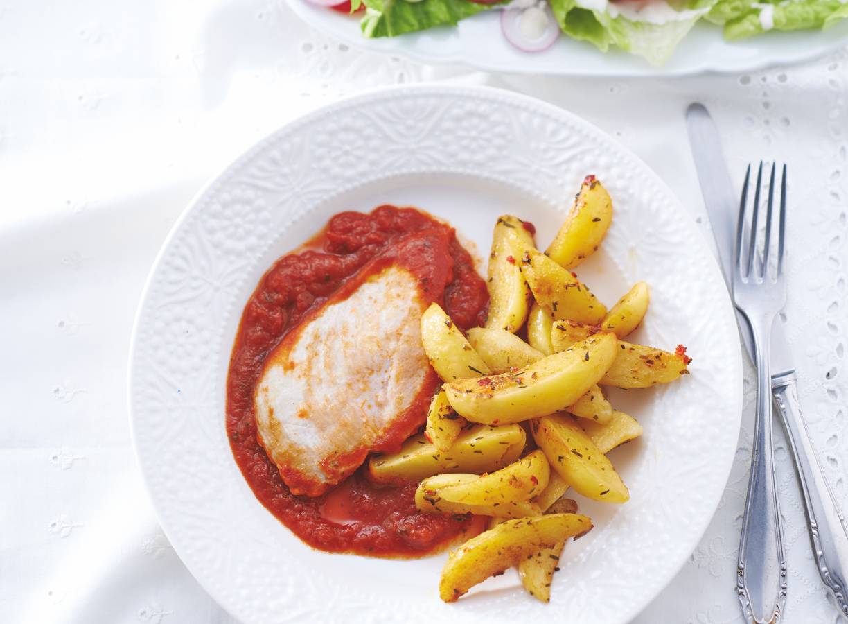 Verhit de helft van de olie in een koekenpan en bak de aardappelpartjes in 10 min. bruin en gaar. Verhit ondertussen de rest van de olie in een hapjespan, bestrooi de kipfilet met peper en bak in 2 min. aan beide kanten bruin aan. Schenk de basilico saus in de pan en stoof de kipfilet met de deksel op de pan op laag vuur in 8 min. gaar.
