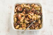 Verwarm de oven voor op 180 °C. Kook de gnocchi 2 min. in water met zout. Laat uitlekken in een vergiet. Verhit een hapjespan zonder olie of boter en bak het spek in 6 min. goudbruin. Neem uit de pan en laat uitlekken op keukenpapier.
