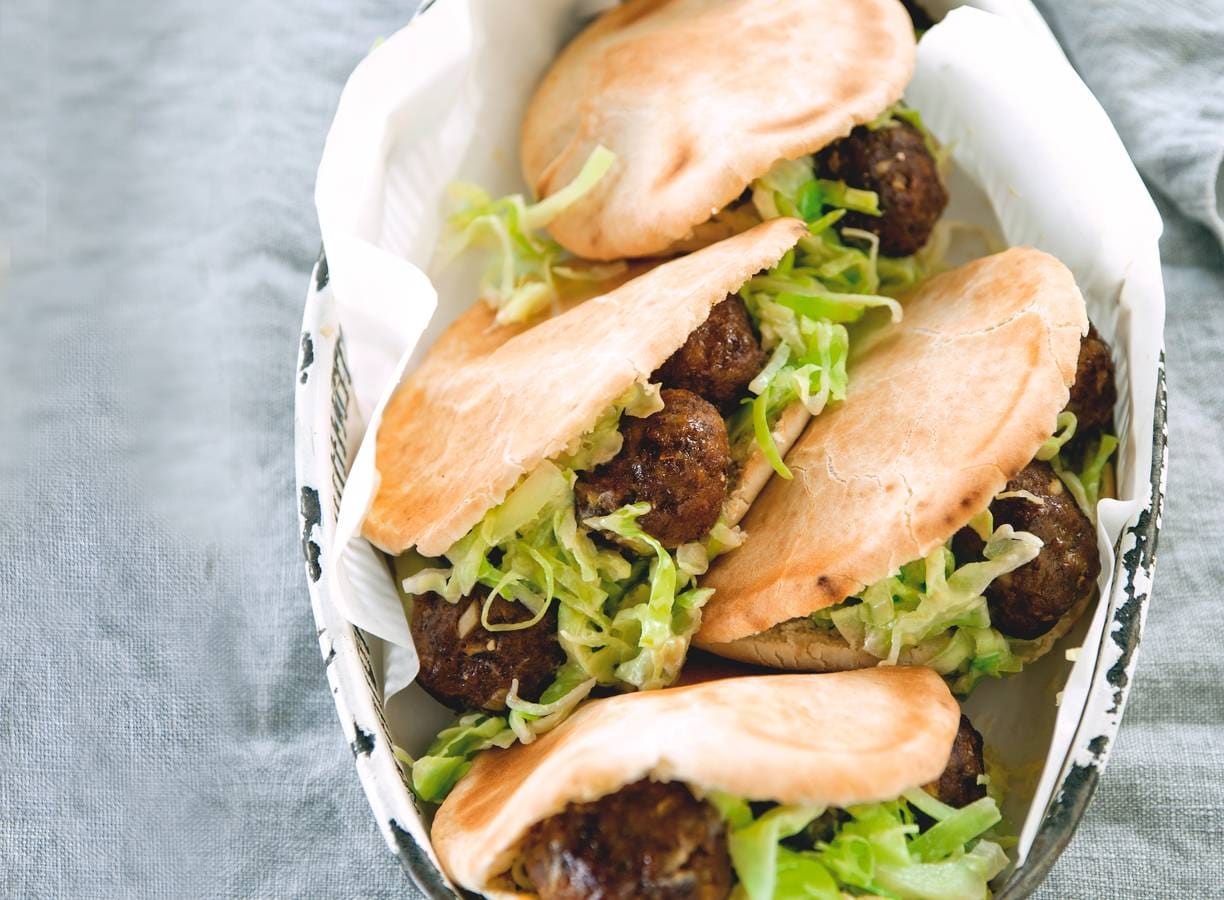 Rooster de shoarmabroodjes in een broodrooster. Snijd ze in, maar niet helemaal door en vul ze met de kool en balletjes.
