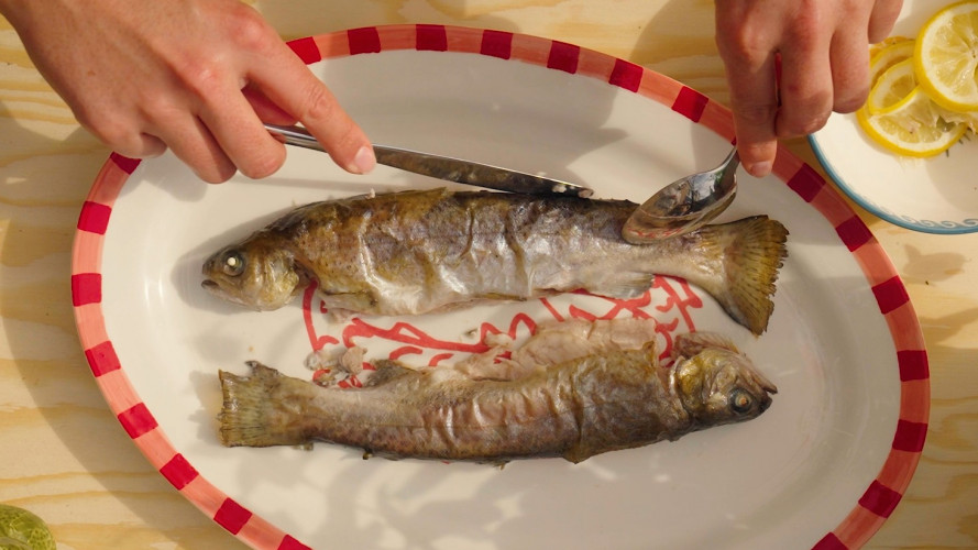 Om de vis van de graat te halen, verwijder je eerst met een mes en lepel de fijne graatjes langs de rug- en buikzijde van de vis — die trek je er heel gemakkelijk uit. Snijd de forel daarna achter de kop in, vlak achter de kieuwen, helemaal tot op de graat. Doe hetzelfde bij de staart.