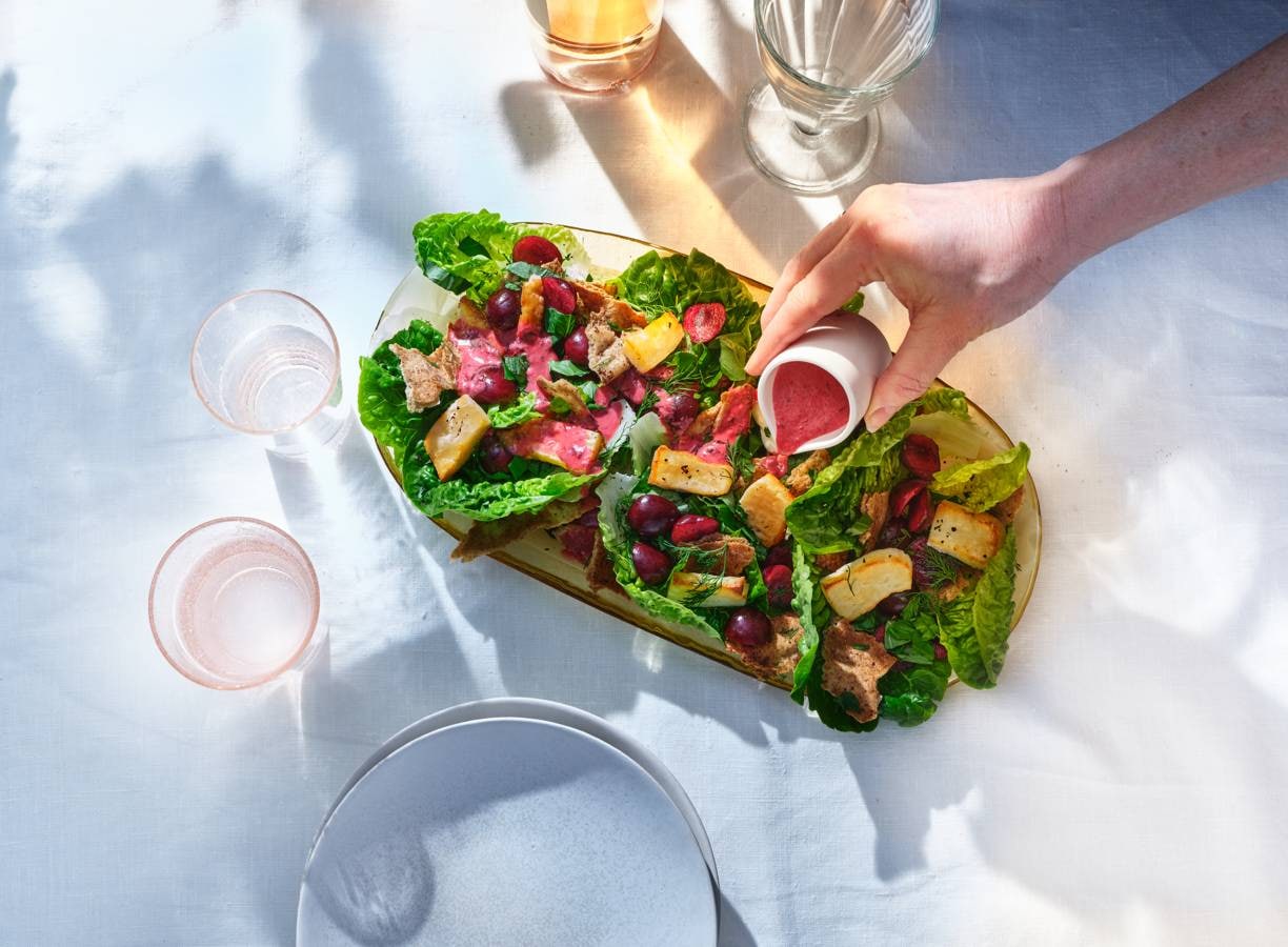 Meng de parten sla met de kruiden, de rest van de kersen, het brood en de halloumi. Verdeel over borden en schep de dressing er rijkelijk over.