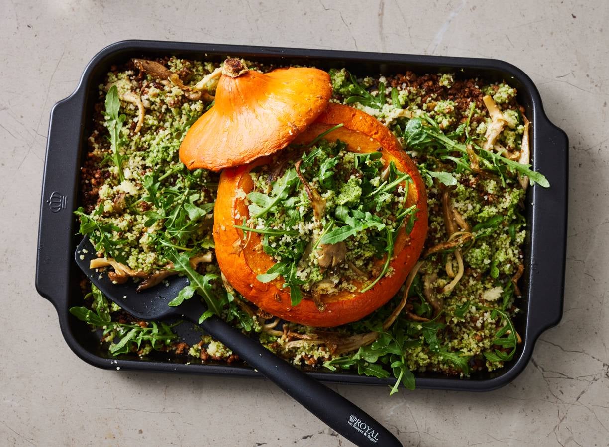 Meng de couscous met de pesto, geroosterde oesterzwammen en rulstukjes, en de rest van de rucola. Vul de pompoen met het couscousmengsel en dek af met het pompoenkapje. Serveer de rest van de vulling ernaast.