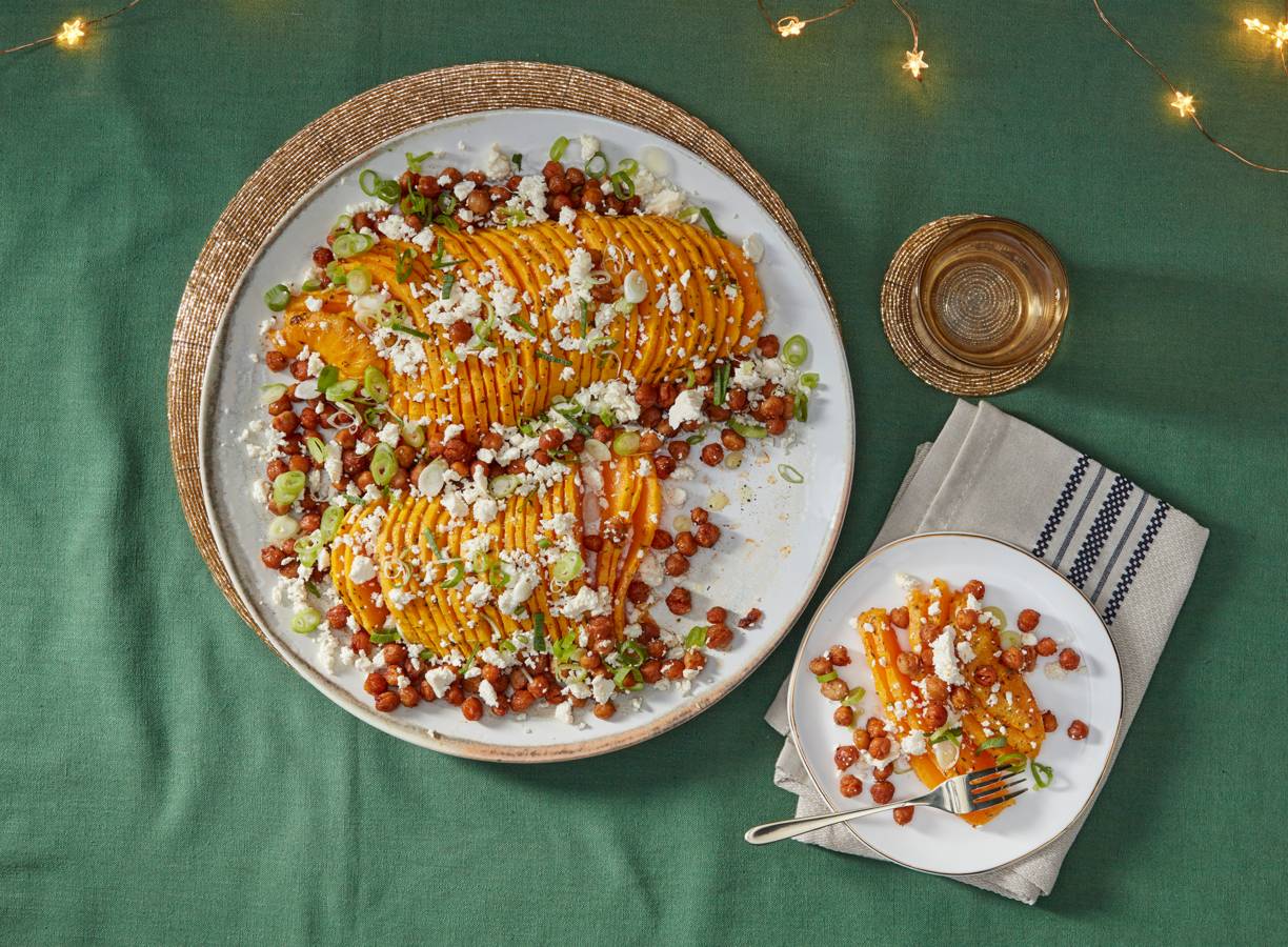 Deze pompoenhasselback met kruidenboter zet je zo op tafel en ziet er uit alsof het uren werk was. Precies wat je wil deze Kerst dus.