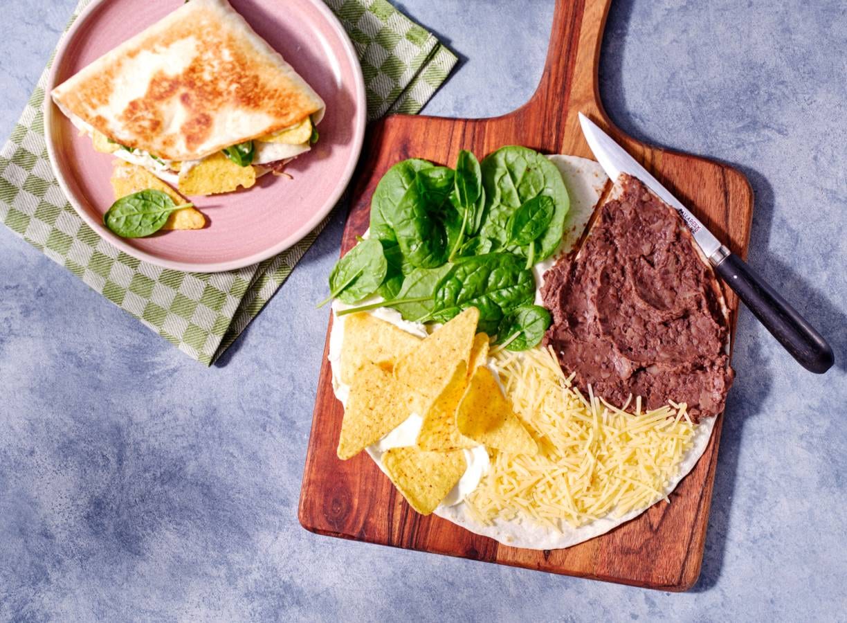 Beleg steeds 1 kwart van de wraps, het deel links van de snede, met bonenspread. Beleg een tweede kwart, aan de rechterkant van de snede, met spinazie. Beleg het kwart linksboven met oude kaas en het kwart rechtsboven met crème fraîche en tortillachips.