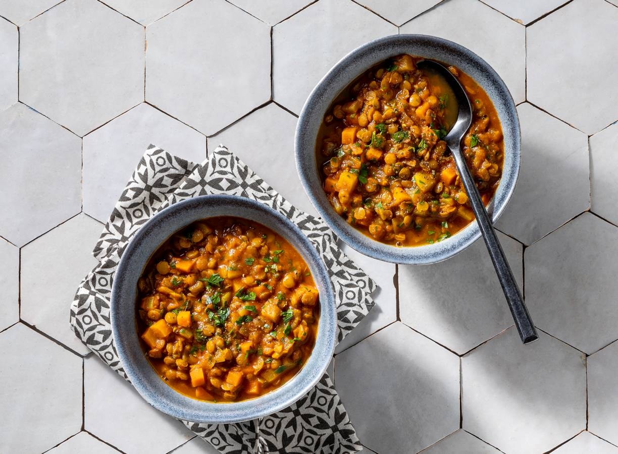 Winterpeen, passata en een melange van onder andere kaneel, komijn en koriander: deze Marokkaanse linzensoep heeft alles wat je zoekt. Heerlijk met de touch van peterselie.