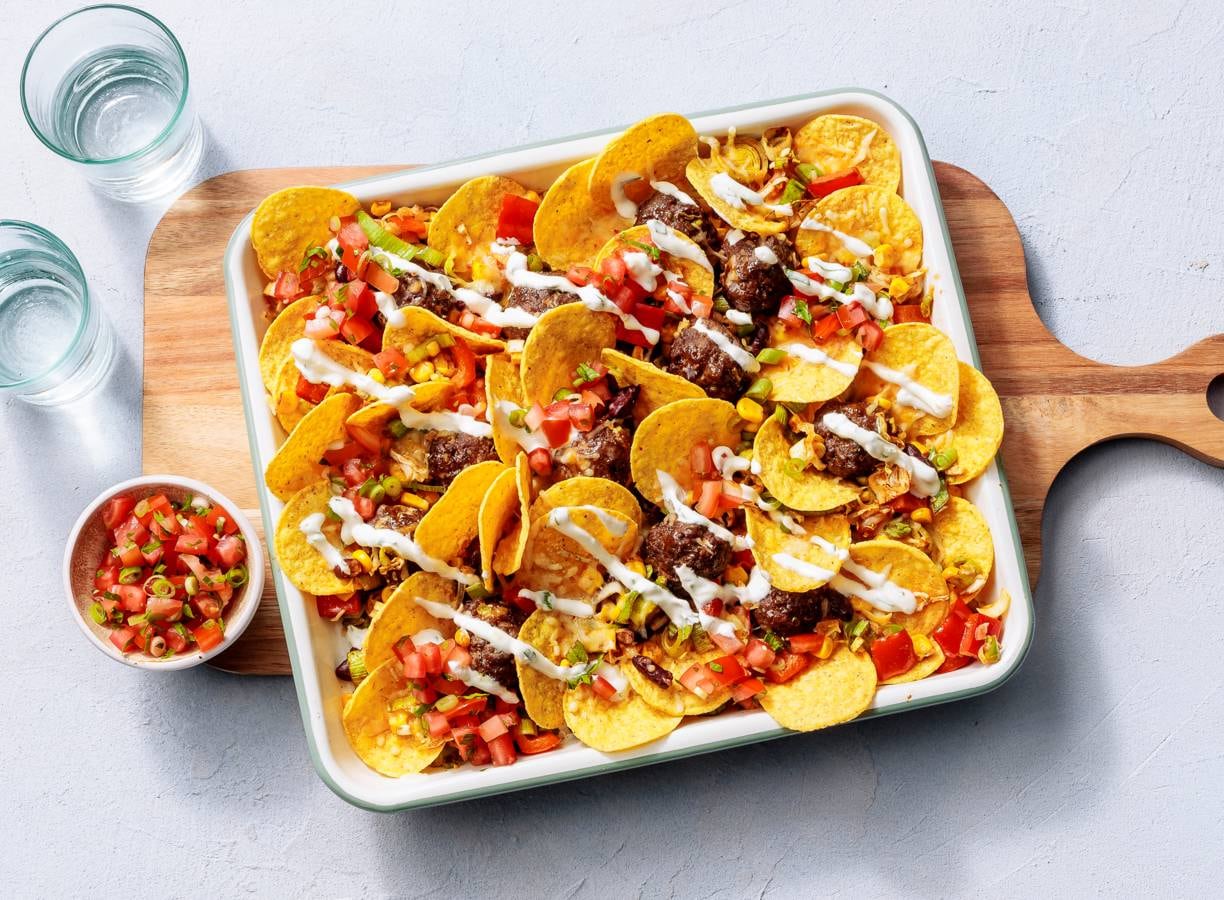 Nacho-traybake met gehaktballetjes