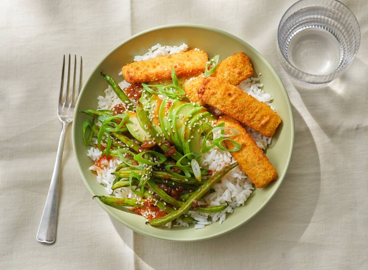 Avondje vis op het menu? Maak het extra feestelijk voor het hele gezin met deze rijstbowl met vissticks, sperziebonen en chilisaus.