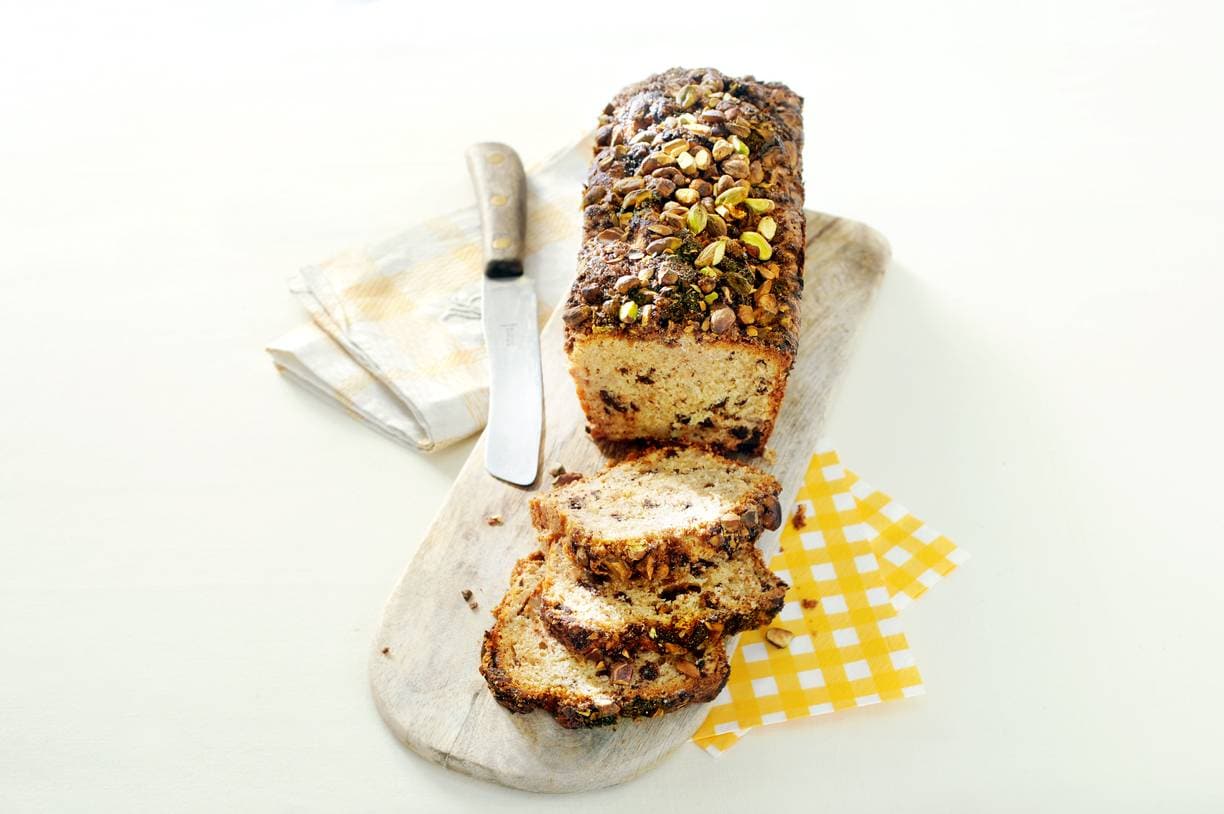 Pel de banaan en prak fijn. Breek de chocolade in stukjes. Hak de noten grof. Zeef in een grote kom de bloem met de bakpoeder, kaneel en het zout. Meng de boter en suiker 20 sec. in de keukenmachine. Laat draaien en voeg 1 voor 1 de eieren en crème fraîche toe. Schep door het bloemmengsel. Schep de banaan en chocolade erdoor. Verdeel over de cakevorm. Bestrooi met de pistachenoten en bruine basterdsuiker.
